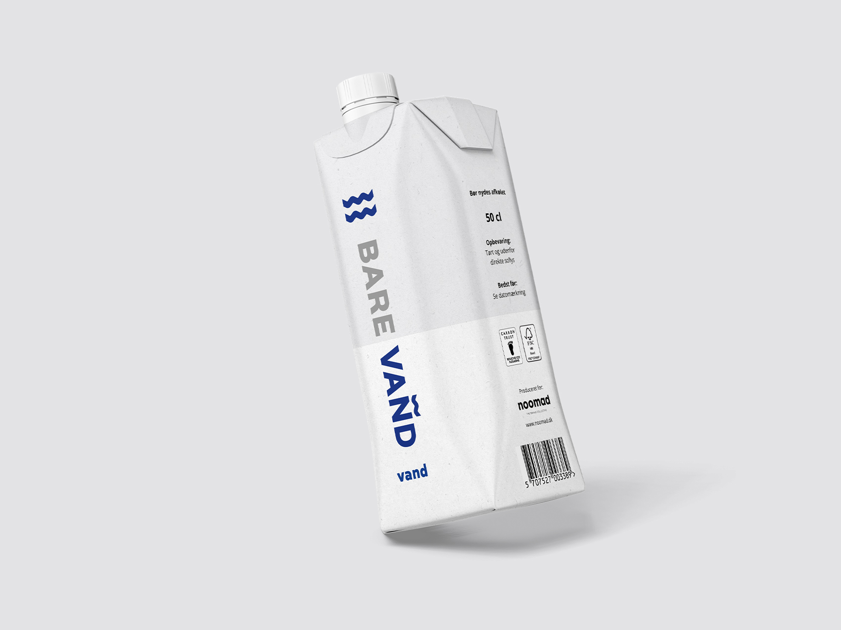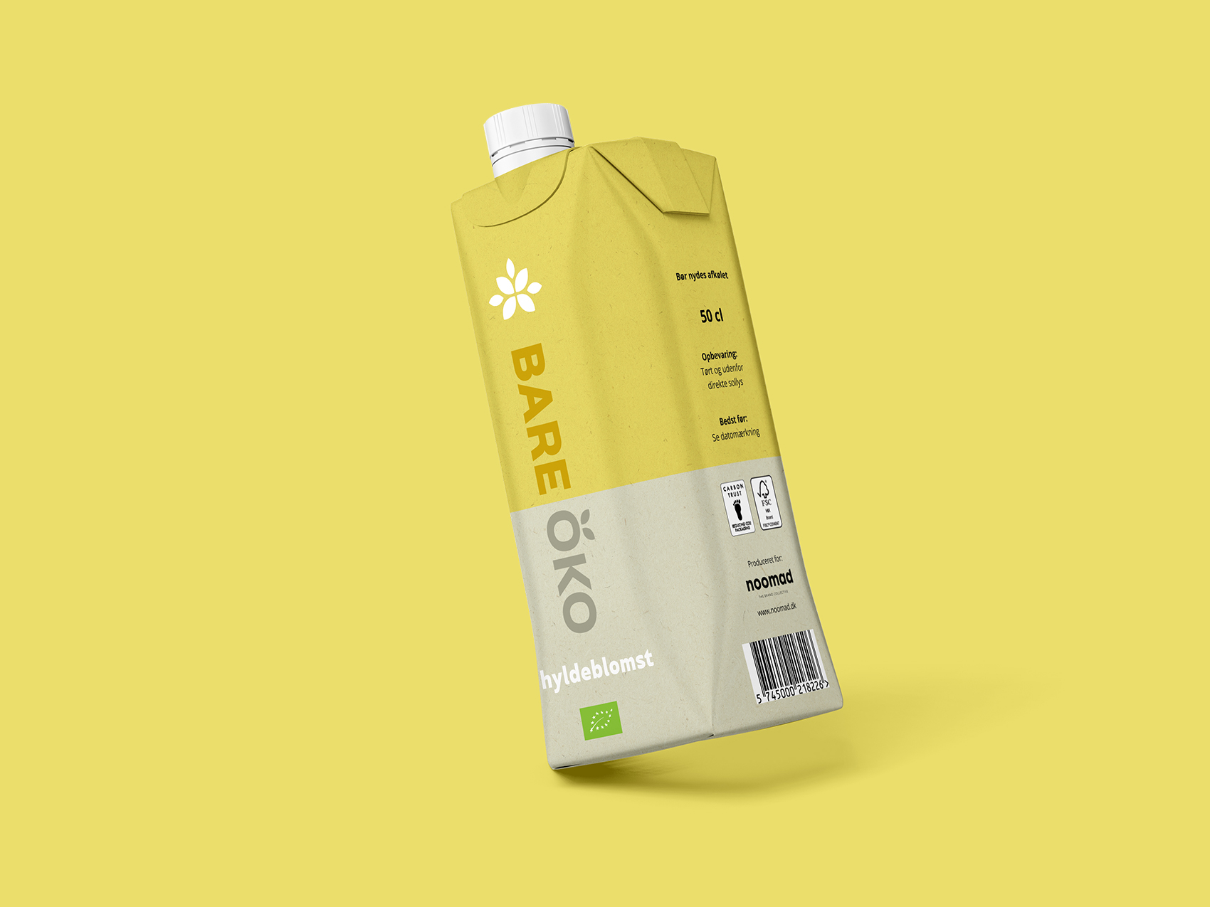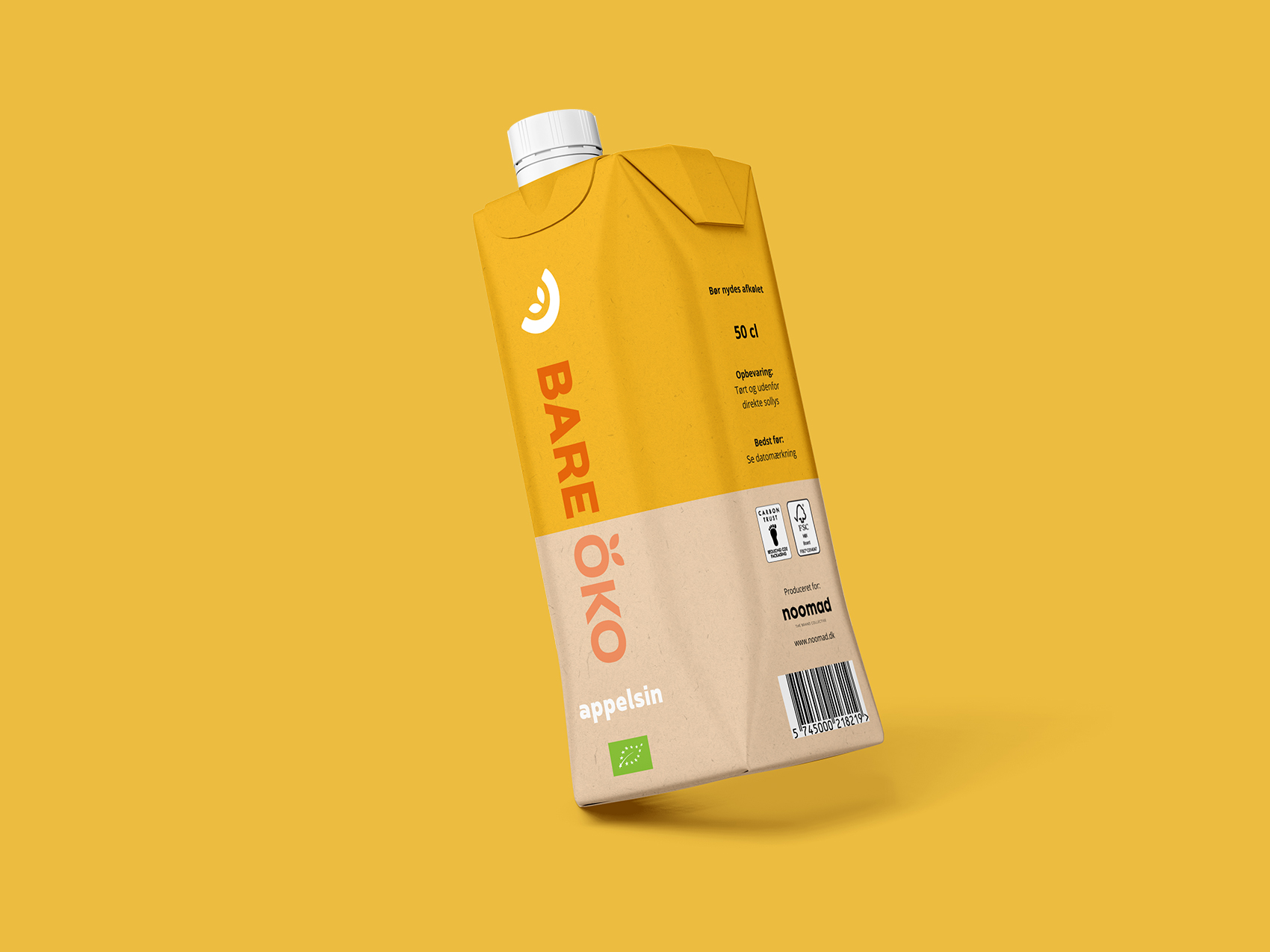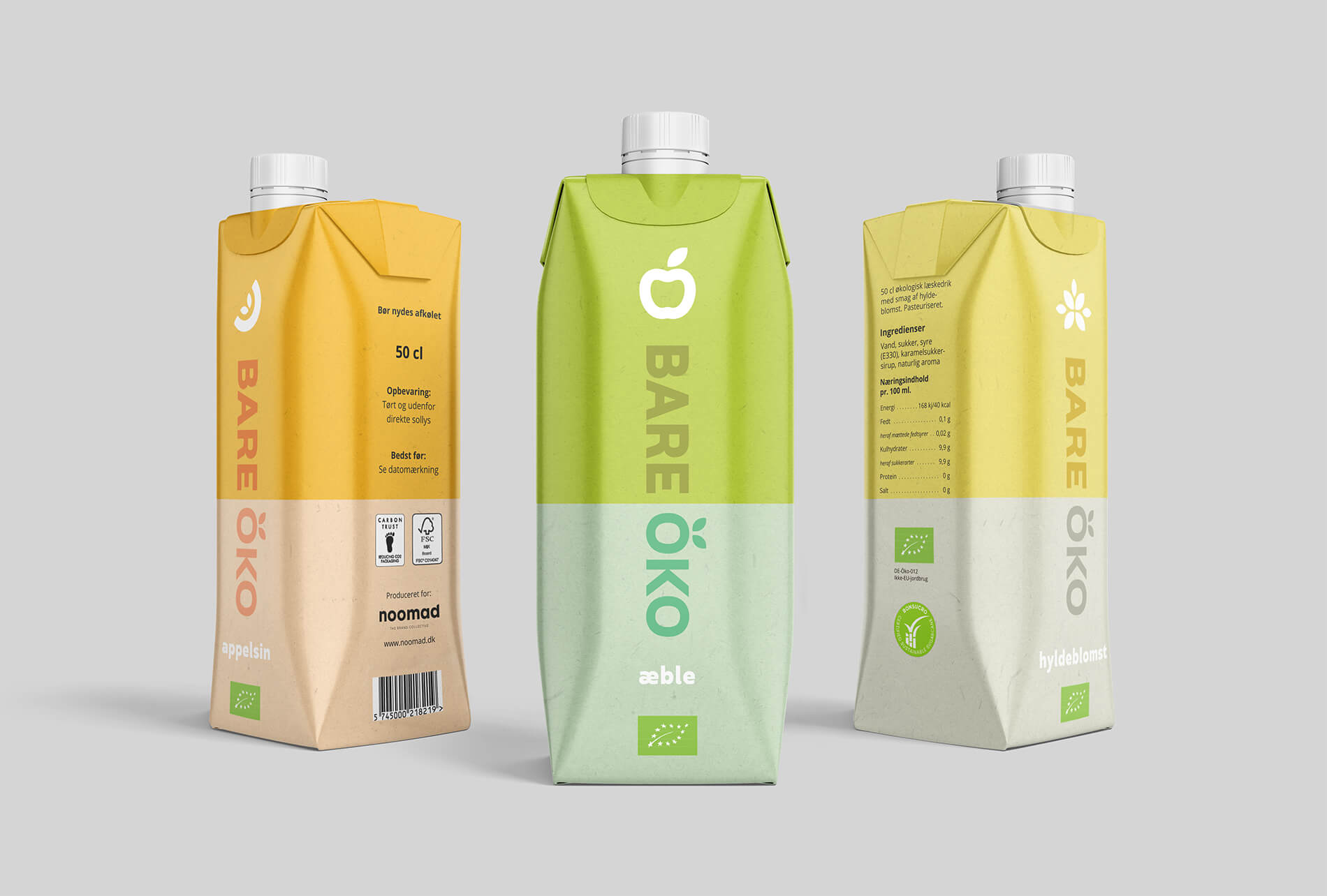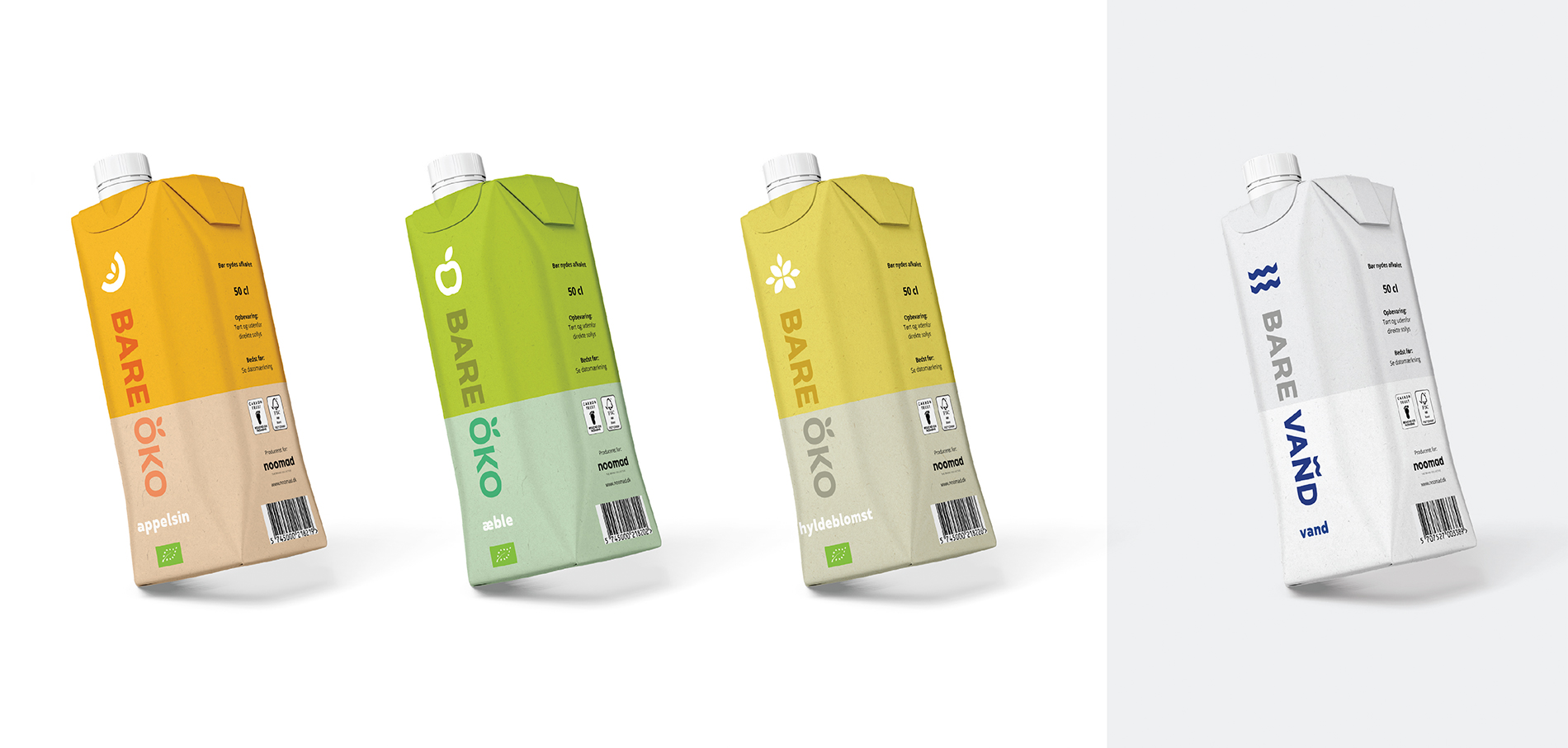 Design af emballage til Noomads privat label mærker; BARE ØKO og BARE VAND. Fokus lå i at skabe et farverigt blikfang samt en tydelig visuel kommunikation af produktets indhold. Det blev et design til 4 forskellige varianter: økologisk appelsinjuice, æblejuice, hyldeblomstsaft og vand. Yderligere var der et ønske om et simpelt typografisk logo til begge mærker.